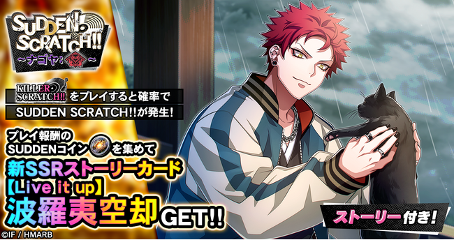 イベント期間中、KILLER SCRATCH!!をプレイするとライズ消費量に応じた確率でSUDDEN SCRATCH!!が発生します。SUDDEN SCRATCH!!をプレイすると、通常の報酬アイテムの他、限定アイテム「SUDDENコイン」を獲得することができます。「SUDDENコイン」を集めることで、ストーリーカード「SSR【Live it up】波羅夷空却」と交換することが可能です。