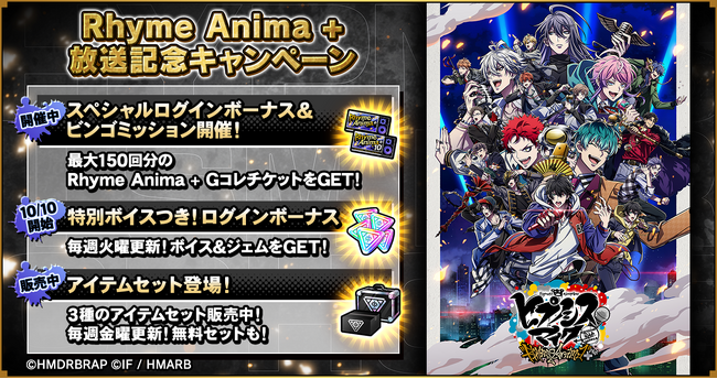 TVアニメ『ヒプノシスマイク-Division Rap Battle-』Rhyme Anima +の放送を記念したキャンペーンを実施しています。スペシャルログインボーナスやビンゴミッションで最大150回分の「Rhyme Anima + Gコレチケット」が獲得できるほか、アイテムセットの販売などを行っております。さらに、キャンペーン期間中対象のGコレクトにて[10回Gコレ]が初回無料で回せます。