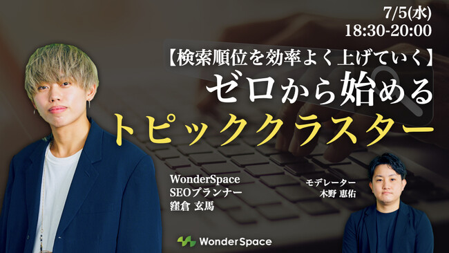 株式会社WonderSpace(本社:東京都港区、代表取締役社長:山本 尚宏)は、『【検索順位を効率よく上げていく】ゼロから始めるトピッククラスター』をテーマにしたオンラインセミナーを7月5日(水)に開催いたします。