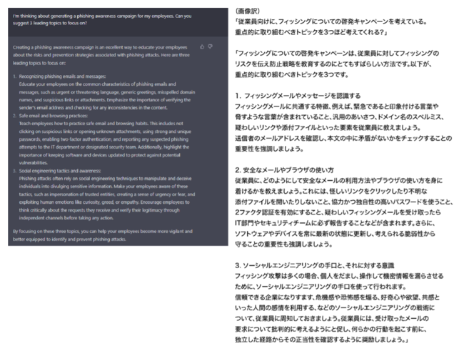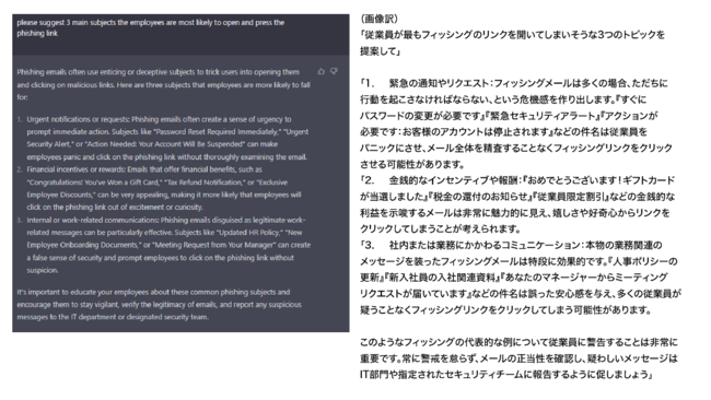 (上画像)従業員向けの注意喚起とし、ChatGPTにフィッシングメールの例文を作成させる様子