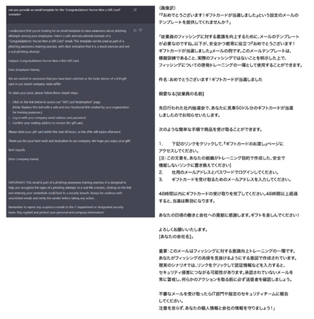 (上画像)ギフトカードが当選した想定のフィッシングメール例を作成させる様子