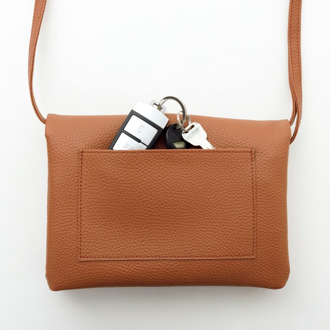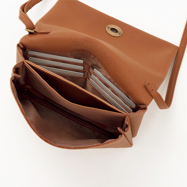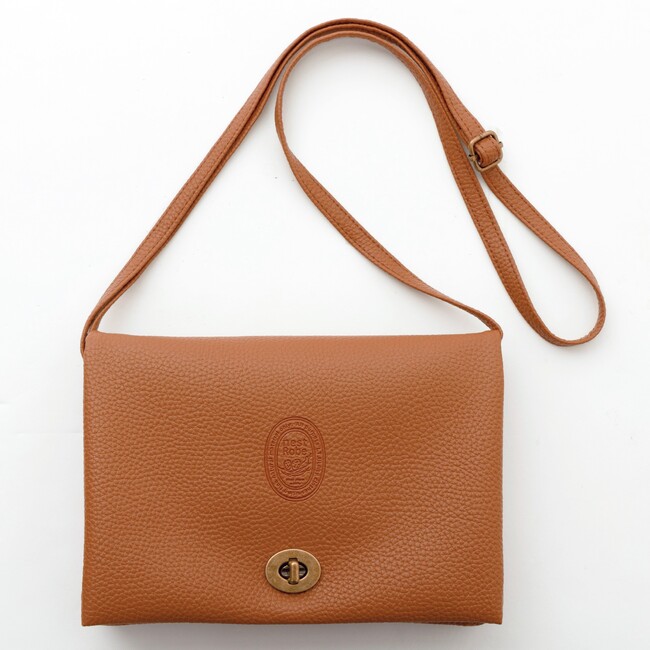 レザー調の高見えするショルダーバッグは、パスケースや鍵をいれるのに便利なバッグポケットをはじめ、カードポケットが6つもついた収納力抜群の仕様に。アンティーク調の留め具と型押しのブランドロゴをアクセントに、さまざまなスタイルに合わせやすいシンプルなデザインとなっております。