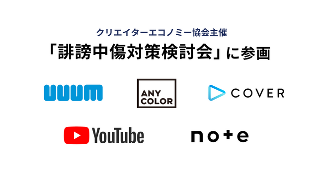 本検討会は、UUUM株式会社・ANYCOLOR株式会社・カバー株式会社・グーグル合同会社(※1)・note、また誹謗中傷問題の有識者である国際大学グローバル・コミュニケーション・センター 准教授 山口真一氏で構成されています。それぞれの立場から意見を交換し、現状を学び合い、ともに課題に取り組んで参ります。