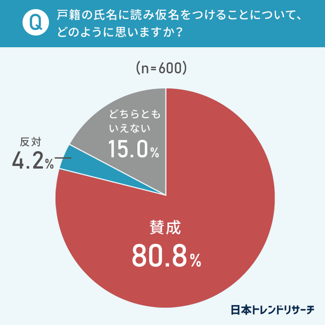 戸籍の氏名に読み仮名をつけることについて、80.8%の方が「賛成」のようです。