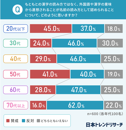 「大空(すかい)」や「光宙(ぴかちゅう)」といった、もともとの漢字の読み方ではなく、外国語や漢字の意味から連想されることが名前の読み方として認められることについて聞いたところ、全体では「反対」が最も多くなりましたが、20代以下と50代では「賛成」が「反対」の割合を上回りました。