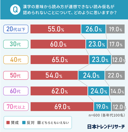 漢字の意味から読み方が連想できない読み仮名が認められないことについて「賛成」という方が6割を超えました。