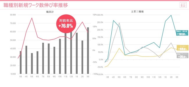 ■2.新規ワーク数は、対前年比で+76.0%。主要職種では倉庫内・軽作業が+161.8%で大きく伸長
