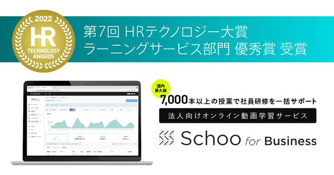 インターネットでの学びや教育を起点とした社会変革を行う株式会社Schoo(本社:東京都渋谷区、代表取締役社長CEO:森 健志郎、以下「スクー」)が提供する法人向けオンライン研修サービス「Schoo for Business」が、経済産業省後援「第7回 HRテクノロジー大賞」において「ラーニングサービス部門 優秀賞」を受賞しました。累計2,500社で導入されている同サービスを通じ、今後も社員の自律的な学びを支援し、社会人教育の発展に寄与してまいります。