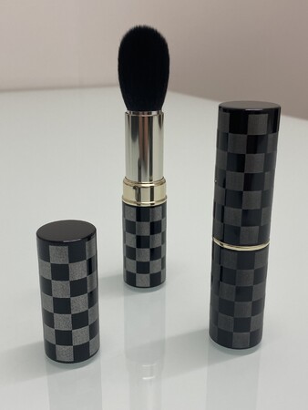 外出先に持ち運びができる携帯筆を展示。肌当りが良く、少し筆に力を持たせることで、ストレスなくフェイスパウダーを塗布したり、化粧直しをすることができます。筆は男らしい柄の市松模様を採用。