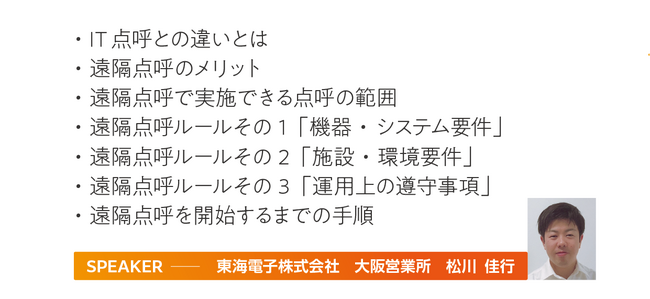 アルコール検知システム、 IT点呼システム、 運行管理システムを開発・販売する東海電子株式会社(本社:静岡県富士市 代表取締役 杉本 哲也)は、 この度、「遠隔点呼の要件把握から運用開始まで!遠隔点呼徹底解説セミナー」を11月17日(金)に無料開催いたします。