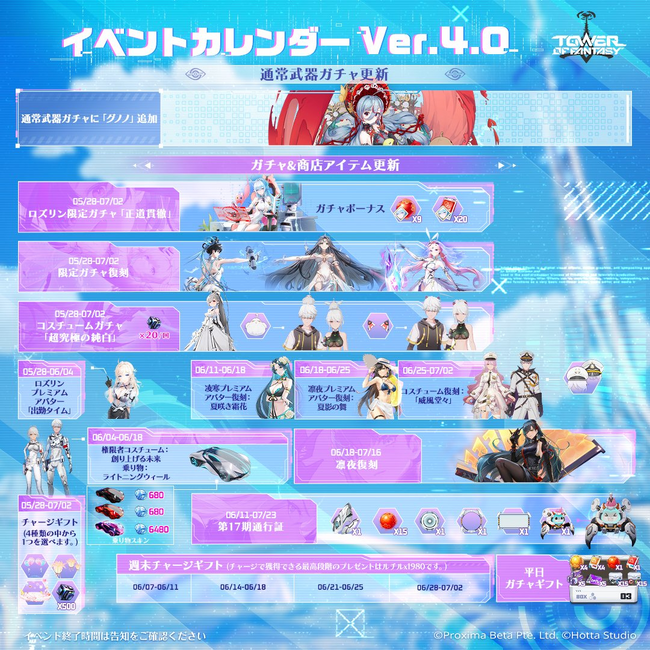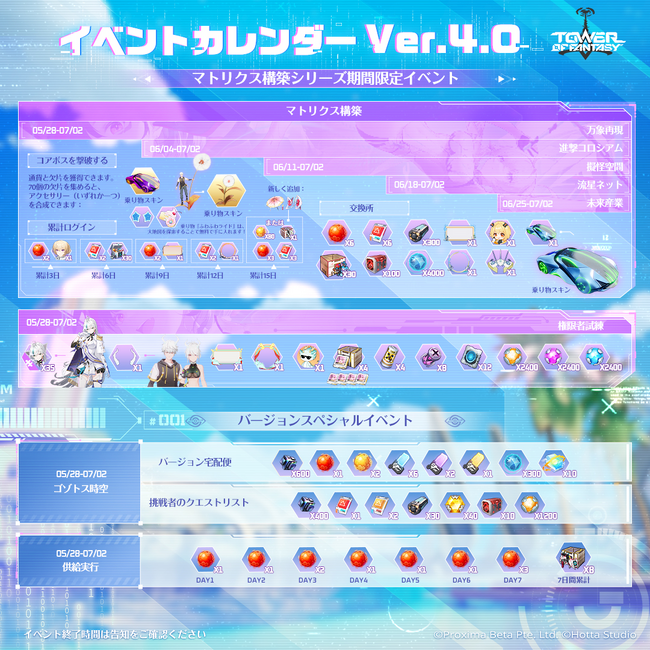最新アップデートVer.4.0「ゴゾトス時空」の各種実装コンテンツに関する詳細情報は、公式X(旧Twitter)「@ToF_JP」および公式サイトで随時更新しますので、フォローをお願いします。
