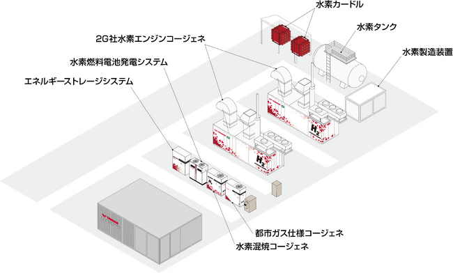 需要に合わせた出力制御が可能で、水素運転による熱電供給で大型の案件にも対応します。ヤンマーの高いメンテナンス技術で、導入後のアフターサービスまで一貫して対応します。水素100%専焼用と都市ガス・水素混焼用の2台を設置しています。