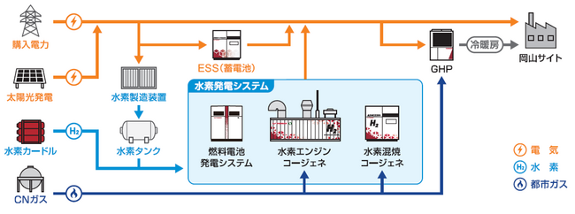 ヤンマーグループでは、「YANMAR GREEN CHALLENGE 2050」を掲げ、自社だけに限らず、お客さまの脱炭素化実現に向け、再生可能エネルギー(以下、再エネ)や水素などの環境に配慮したソリューションの開発を進めています。今回、ガスヒートポンプエアコン(GHP)やマイクロコージェネレーションシステム(CHP)を製造するヤンマーエネルギーシステム製造株式会社敷地内の岡山試験センターに、水素発電システムや蓄電池などのクリーンエネルギー機器の耐久試験や技術開発およびそれらを組み合わせた最適運用の実証試験を行う本施設を設置しました。