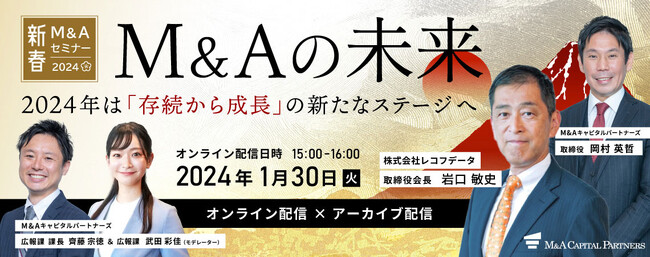 M&Aキャピタルパートナーズ株式会社(東京都中央区・代表取締役社長 中村 悟) は、2024年の新春セミナーとして、M&Aに興味をお持ちの経営者様たちを対象とした、M&A業界の最新動向をお伝えするセミナーを開催いたします。