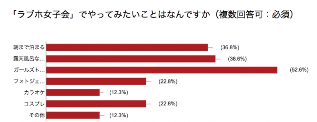 「ガールズトーク」(52.6%)、「露天風呂などに入る」(38.6%)、「朝まで泊まる」(36.8%)、「フォトジェニック撮影会」(22.8%)、「コスプレ」(22.8%)、「カラオケ」(12.3%)といった回答が寄せられました。