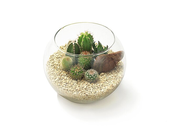 お手入れが簡単なサボテンを寄せ植えして、自然の風景を再現。ガラスなどの透明な容器に生物を入れて育てる「テラリウム」に仕上げました。スタイリッシュなインテリアアイテムとして男性にも大人気です。