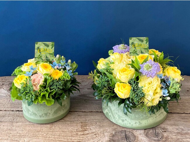 父の日といえば「黄色いバラ」も定番。たっぷりのバラにブルー系の花々をプラスした鮮やかなコントラストのアレンジメント。