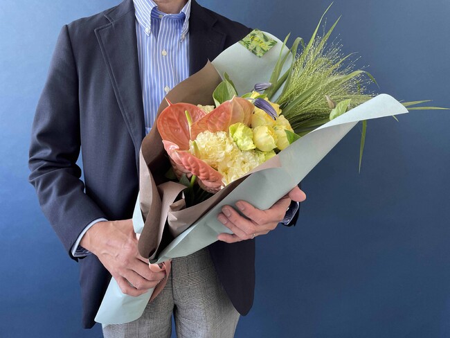 お父さんに似合うように計算された絶妙な色使いのブーケで、いつもと違うサプライズを!