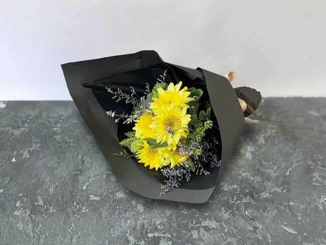 父の日の定番、黄色のバラと季節の花々をスマートに束ねたスタイリッシュなブーケ。