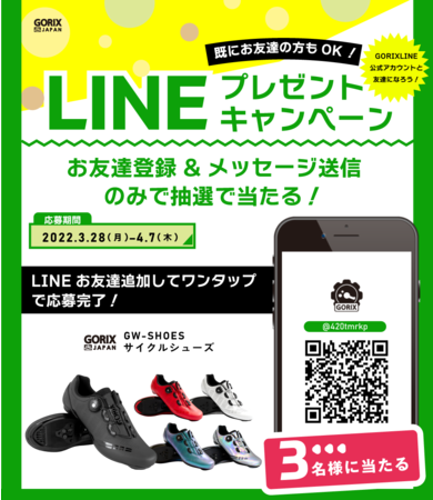 自転車パーツの開発・製造・販売を手掛ける、GORIX株式会社(所在地:大阪市東淀川区瑞光3-9-29、代表取締役:長野明)の自転車パーツブランド「GORIX」のLINE公式アカウントで、3/28(月)〜4/7(木)23:59まで新商品の「ダイヤル調節式サイクルシューズ(GW-SHOES)」が3名に当たるプレゼントキャンペーンを開催!! 応募条件は「GORIX」LINE公式アカウントのお友達追加とメッセージ「gorix」の送信のみで、簡単に応募が出来ます。