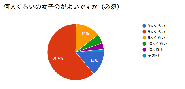 ホームパーティー好きな女性に聞いたところ、一番多い回答が「5人くらい」(61.4%)でした。次いで「3人くらい」(14%)、「8人くらい」(14%)、「10人くらい」(5.3%)、「10人以上」(3.5%)という結果になり、女子会の最適参加数はおおよそ4〜6人くらいが良いという傾向がわかりました。