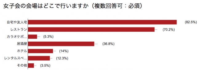 「自宅や友人宅」(82.5%)、「レストラン」(70.2%)、「居酒屋」(36.8%)といった回答が寄せられました。その他「ホテル」、「レンタルスペース」、「カラオケボックス」といった回答もありました。