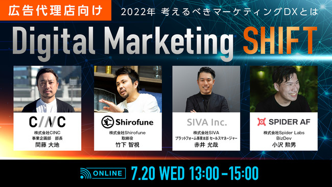 株式会社CINC(シンク、以下CINC)は、2022年7月20日(水)に株式会社Shirofune、株式会社SIVA、株式会社Spider Labsとオンラインセミナー『【広告代理店向け】Digital? ?Marketing? ?SHIFT? 〜?2022年?考?え?る?べ?き?マー?ケ?ティ?ン?グ?DX?と?は?〜?』を開催いたします。