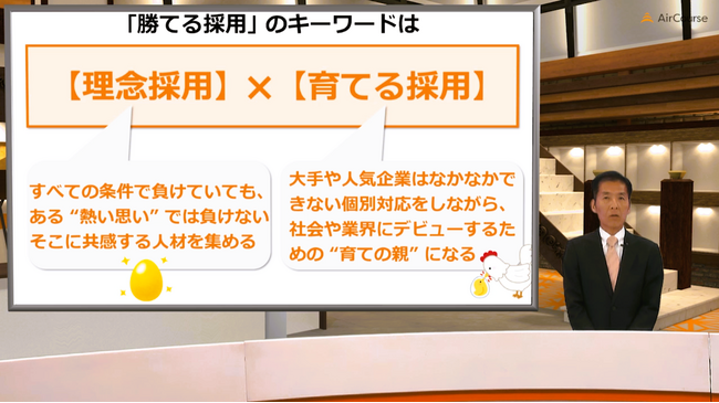 本コースでは、数百社にわたる採用コンサルティング実績のある講師が、新卒・中途採用の基礎から、自社が求める人材を採用するための実践ノウハウをご紹介します。企業理念等の“熱い思い”を発信して共感を得る「理念採用」や、早期に候補者を絞り込んで入社動機を育て上げる「育てる採用」など、業界や企業規模に関係なく実践いただける内容です。ぜひ、採用業務に関わる全ての方の研修教材としてご活用ください。