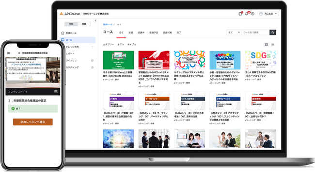 「AirCourse」( https://aircourse.com )は、企業向け社員教育eラーニングサービスです。社員教育でニーズの高い動画eラーニングコース746コースが受け放題(6月29日現在)となっているほか、簡単に自社の研修動画、マニュアル動画などを共有・配信できます。初期費用0円でローコストで運用でき、スマホ・PC・タブレットなどマルチデバイスに対応しています。eラーニングだけでなく、集合研修の管理や受講状況・成績レポートなどの管理機能が充実しているため、社員教育を効率化したい企業に最適です。