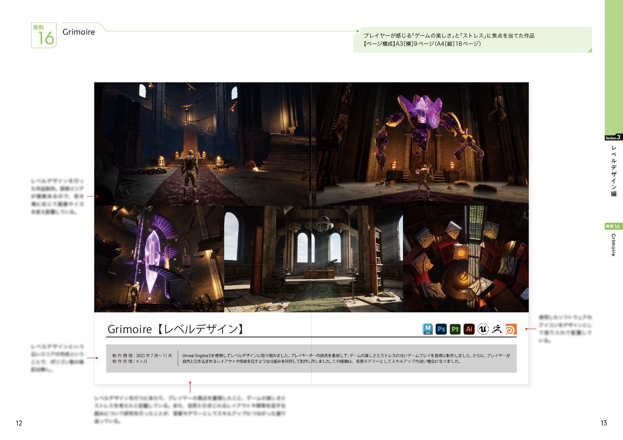 アニメーターやエフェクトアーティスト、コンポジターは基本的にデモリールが必須となり、ポートフォリオは必ずしも必要としないからです。本書は、キャラクターモデラー、背景モデラーに加え、レベルデザインのポートフォリオも掲載しています。レベルデザインとは、ゲーム開発においてプレイヤーが実際に体験するステージやマップ、進行の流れを設計する作業のことを指します。