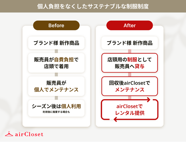 ブランド様は、販売員の方の個人負担を軽減する制服制度をより持続可能性の高い取り組みにするため、連携を開始しました。
