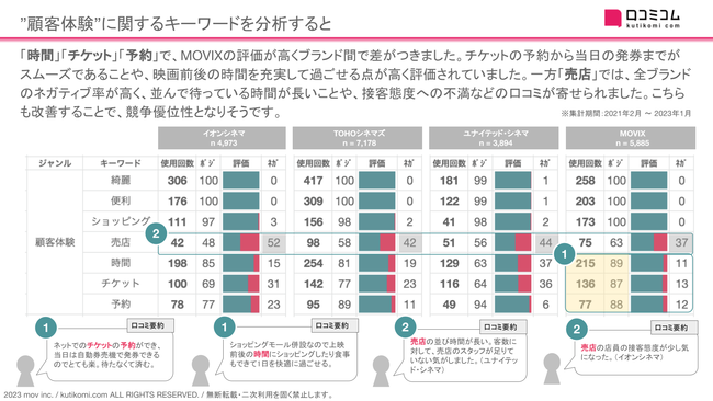 ・映画館の口コミでブランド差がでたワードは「チケット」「予約」で、チケットを予約する際のスムーズさが顧客満足の向上につながること