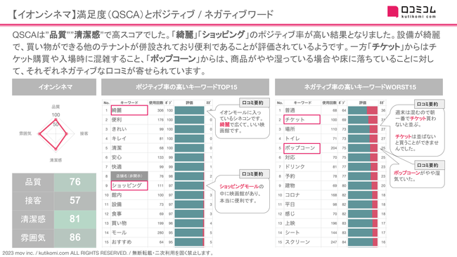それらのAI解析を用いた分析例として「イオンシネマ」のQSCA・頻出ポジネガキーワードを確認しました。