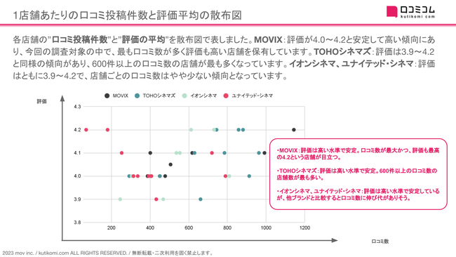 各店舗の”口コミ投稿件数”と”評価の平均”を散布図で表しました。MOVIX:評価が4.0〜4.2と安定して高い傾向にあり、今回の調査対象の中で、最も口コミ数が多く評価も高い店舗を保有しています。TOHOシネマズ:評価は3.9〜4.2と同様の傾向があり、600件以上の口コミ数の店舗が最も多くなっています。イオンシネマ、ユナイテッド・シネマ:評価はともに3.9〜4.2で、店舗ごとの口コミ数はやや少ない傾向となっています。