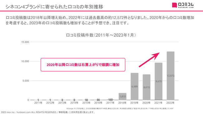 ・2020年〜2022年の新規投稿口コミ件数がコロナ禍でも右肩上がりに増加しており、今後も増加が予想されること