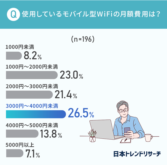 モバイル型Wi-Fiの月額費用は、合わせて約8割の方が4000円未満に抑えているようです。