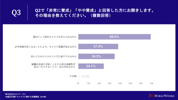 Q2で「非常に賛成」「やや賛成」と回答した方に、「Q3.その理由を教えてください。(複数回答)」(n=29)と質問したところ、「節目として別のキャリアを考えられるから」が69.0%、「定年時期が近くなることにより、キャリア意識が高まるから」が37.9%、「若いうちからリスキリングに着手できるから」が34.5%という回答となりました。