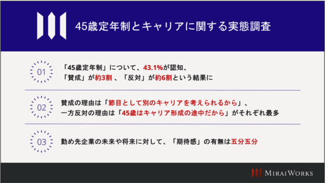プロフェッショナル人材のフリーランス・副業といった多様な働き方をサポートする株式会社みらいワークス(本社:東京都港区、代表取締役社長:岡本祥治、証券コード:6563)は、2023年度(2023/4/1〜2024/3/31)に45歳を迎え、大企業(1,000名以上)で総合職相当の正社員として勤務するビジネスパーソン102名を対象に、45歳定年制とキャリアに関する実態調査を実施いたしましたので、お知らせいたします。