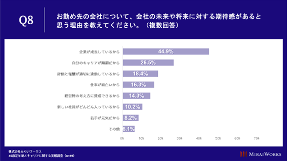 Q7で「非常にある」「ややある」と回答した方に、「Q8.お勤め先の会社について、会社の未来や将来に対する期待感があると思う理由を教えてください。(複数回答)」(n=49)と質問したところ、「企業が成長しているから」が44.9%、「自分のキャリアが順調だから」が26.5%、「評価と報酬が適切に連動しているから」が18.4%という回答となりました。