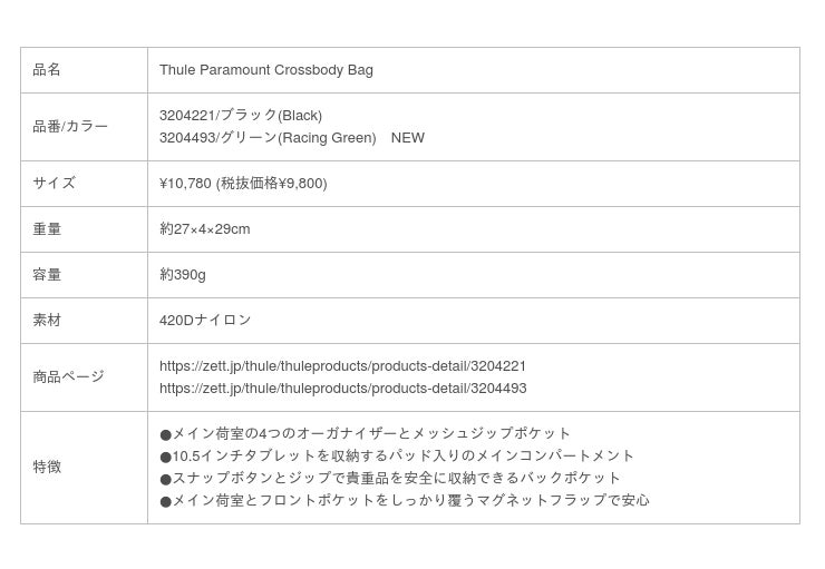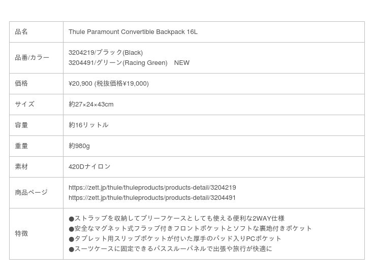 ゼット株式会社(本社/大阪市天王寺区、代表取締役社長/渡辺裕之)が取り扱うスウェーデンのブランド『THULE(スーリー)』より、忙しい都市生活での移動を快適にする「Thule Paramount」の新色を10月に発売いたしました。バックパック(27L、24L、16L)とショルダーポーチに、Racing Green(グリーン)とTimberwolf(ベージュ)の最大2色を追加します。