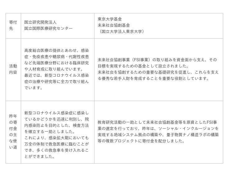 寄付先は、「国立研究開発法人 国立国際医療研究センター」、「東京大学基金 未来社会協創基金(国立大学法人東京大学)」、寄付金額は、両団体に4,956,546円ずつ、合計9,913,092円です。