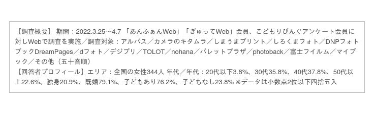 園児とママ・パパの情報誌「あんふぁん」「ぎゅって」を発行する株式会社こどもりびんぐ(所在地:東京都千代田区、代表取締役:中島一弘)は、 「シルミル研究所」としてリサーチ事業を展開しています。「シルミル研究所」では、全国の女性を対象にした調査「ウーマンリサーチ」を実施し、 女性が選ぶおすすめの商品やサービスをランキング形式で、Webコンテンツとして発信しています。今回は2022年3〜4月に実施した「フォトブック作成サービスについての調査」の結果を発表します。