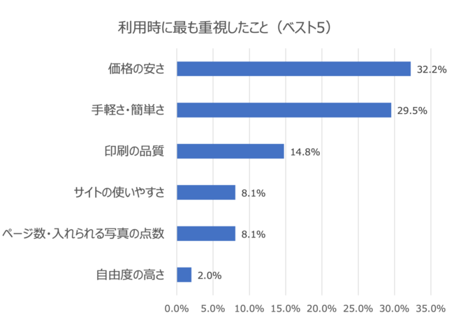 利用時に最も重視したポイント上位は、「価格の安さ」が32.2%、「手軽さ・簡単さ」29.5%、「印刷の品質」14.8%となりました(グラフ2)。