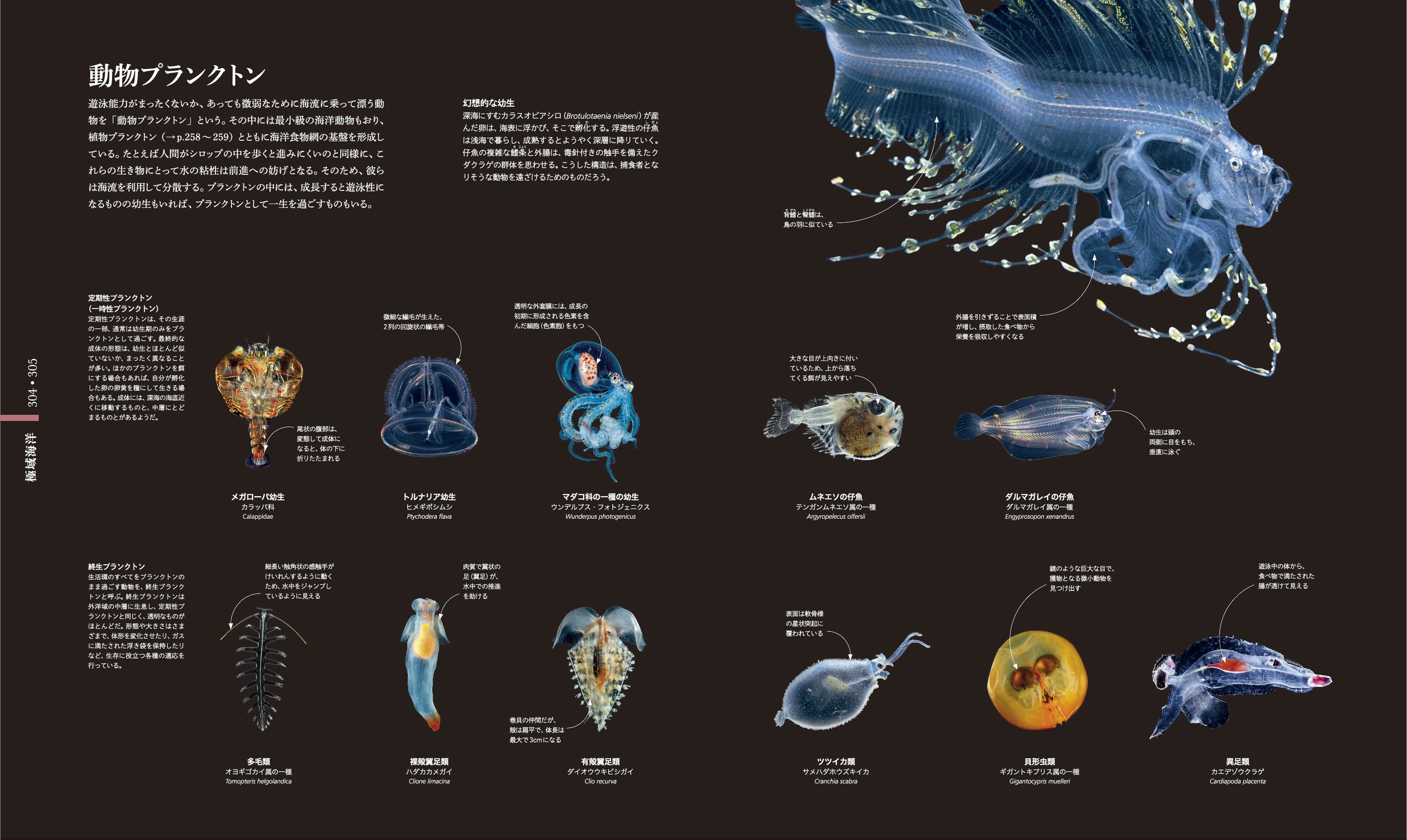 《ぱらぱらめくると、数え切れない海の生き物が、分厚い頁に所狭しと躍っている。ほとんどの読者にとって見たこともない生物が、随所に溢れんばかりに描き込まれている。一方で、クジラだタコだイソギンチャクだと海藻だと誰もが知る生き物の紙面には、繰る者を隠された謎へ導く扉がしっかりと開かれているではないか。》