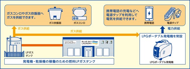 災害対応型ランドリーは「標準仕様」として3日分のLPガスを貯槽できるLPガスボンベ又はガスタンク、ポータブル発電機への接続が可能な設備を完備します。ポータブル発電機はガスを利用して発電する仕組みになっており、携帯電話充電などへ電力供給することが可能です。また、店舗にガスコンロ、ガス炊飯器を導入し、被災者向けの炊き出しが可能となり、コインランドリーを“一時避難所“として活用する事ができます。