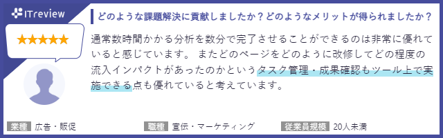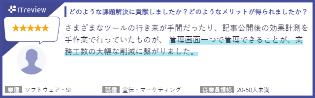 ITreviewにて、SEARCH WRITEを実際に利用いただいているお客様よりたくさんのお声をいただいております。お客様からは「SEOの知識がなくても、何をすべきか分かりやすい」「導入サポートが手厚い」「工数が大幅に削減できた」などのコメントをいただきました。
