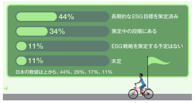 ESG戦略の策定状況については、「長期的なESG目標を策定済み」(世界平均・日本ともに44%)、「策定中の段階にある」(世界平均:34%、日本:29%)という結果となりました。一方で、「未定(11%)」と「策定する予定はない(17%)」を合わせて約3割の日本企業・組織では、ESG戦略の策定が進んでいないようです。