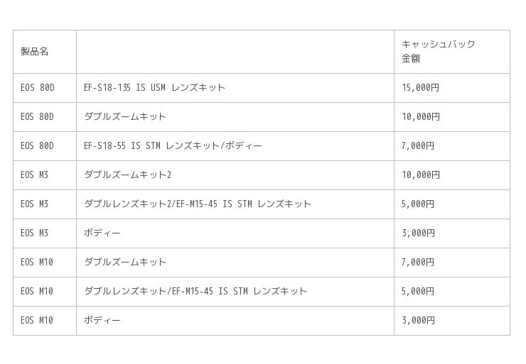(EOS M3・クリエイティブマクロキット各種、EOS M3・ダブルズームキット、EOS M3・ダブルレンズキット、EOS M3・EF-M18-55 IS STM レンズキット、EOS M3・EVFキット各種)