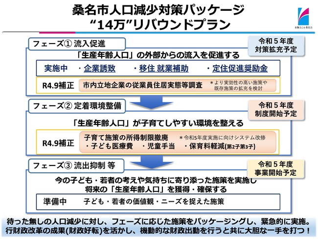 日本全体の課題でもある、人口減少、少子高齢化は、桑名市でも重要な課題です。特にコロナ禍の影響で、ここ数年、出生数の減少が顕著に表れております。このような状況を目の当たりにし、私は強い危機感を抱き、迫り来る人口減少の波に対して緊急的に対策を講じていく所存です。