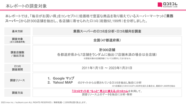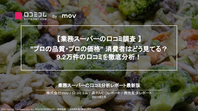 本レポートでは、「毎日がお買い得」をコンセプトに低価格で豊富な商品を取り揃えているスーパーマーケット『業務スーパー』から計300店舗を抽出し、各店舗に寄せられた口コミ(総数92,199件)を分析しました。